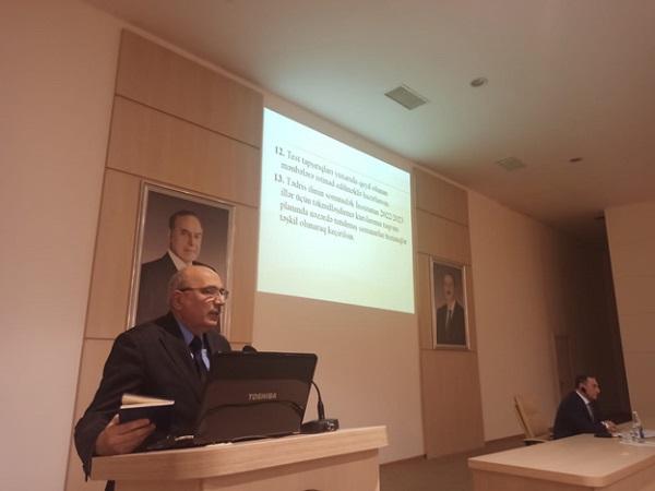 II məsələ üzrə institutun rektoru professor N.A.Qasımov çıxış edərək bildirdi ki, 2023-cü il xalqımızın fəxri olan şəxsiyyətlər Heydər Əliyevin 100 illik, Əziz Əliyevin 125 illik, Zərifə xanım Əliyevanın 100 illik yubileyləri ilidir. Bu yubileylərə ölkəmizdə çox saylı tədbirlər həsr olunacaq və həyata keçiriləcəkdir. Xüsusilə bu ilin Prezidentimiz cənab İlham Əliyev tərəfindən “Heydər Əliyev ili” elan olunması həmin tədbirlərə daha çox məsuliyyətlə yanaşmağı tələb edir. İnstitutumuzda da belə tədbirlər silsiləsi planlaşdırılmışdır. 2023-cü ildə hər bir şəxsiyyətə, onların döğum günlərinə yaxın müddətdə, həsr olunmuş elmi-praktik konfrans keçiriləcəkdir. Konfranslara xaricdə çalışan elm adamlarının da dəvət olunduqlarını nəzərə alaraq onların beynəlxalq statusda keçiriləcəyi qərara alınmışdır. Sonra rektor həmin konfranslara hazırlıq işləri haqqında danışmış,bəzi məsələlərlə əlaqədar tapşırıqlar vermişdir.