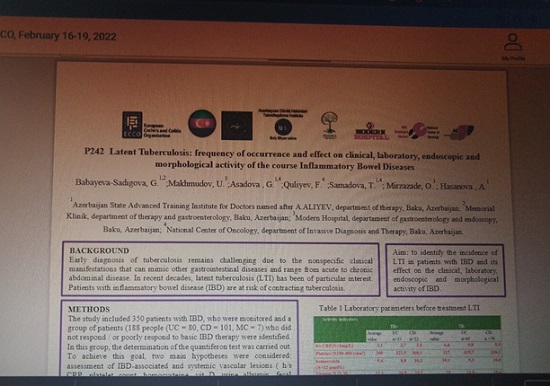 16-19 fevral 2022-ci il tarixində ECCO-nun (Kron xəstəliyi və xoralı kolit üzrə Avropa Təşkilatı) növbəti 17-ci konqresi Avstriyanın paytaxtı Vyanada pandemiya ilə əlaqədar onlayn formatında keçirilmişdir. Ölkəmizi bu tədbirdə Ə.Əliyev adına Azərbaycan Dövlət Həkimləri Təkmilləşdirmə İnstitutunun terapiya kafedrasının dosenti Gülüstan Babayeva təmsil etmişdir.Onun “Lesions of Cytomegalovirus and Epstein-Barr virus of the proximal gastrointestinal tract in patients with Inflammatory Bowel Disease after COVID-19” və “Latent Tuberculosis: frequency of occurrence and effect on clinical, laboratory, endoscopic and morphological activity of the course Inflammatory Bowel Diseases” elmi-tədqiqat işləri üzrə cıxışları maraqla qarşılanmışdır.