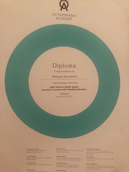 16-17 noyabr 2023-cü il tarixdə Macarıstanın paytaxtı Budapeşt şəhərində "Qanaxmalı xəstələrin müasir müalicəsi" mövzusunda beynəlxalq konfrans keçirilmişdir. 20-yə yaxın Avropa ölkəsinin aparıcı hematoloq və genetiklərinin qatıldığı tədbirdə Ə.Əliyev adına Azərbaycan Dövlət Həkimləri Təkmilləşdirmə İnstitutunun hematologiya kafedrasının əməkdaşı Mehparə Kazımova da iştirak etmişdir. Onun "Azərbaycanda irsi qan laxtalanma pozğunluğu xəstəlikləri, statistika,diaqnostika,müasir müalicə" adlı prezentasiyası maraqla qarşılanmışdır. Bu zaman verilən suallar cavablandırılmış,mövzu ətrafında diskussiya aparılmışdır. Münsiflər heyətinin qərarı ilə məruzə yüksək qiymətləndirilmiş və müvafiq diplomla təltif olunmuşdur.