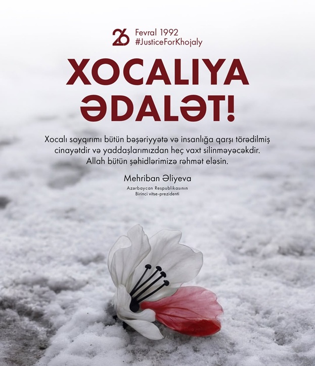 Hər il fevralın 26-da Azərbaycan xalqı Xocalı soyqırımının qurbanlarının xatirəsini yad edir. Bu faciədən keçən illər ərzində Azərbaycan xalqı dünya xalqlarına, dövlətlərinə, beynəlxalq təşkilatlara haqq-ədaləti və həqiqəti müdafiə etmək, Xocalıda törədilmiş terrorizm, etnik təmizləmə faktlarını pisləmək barədə müraciətlər etmişlər. Xocalı soyqırımının günahkarları, təşkilatçıları və icraçıları layiqli cəzalarına çatmalıdırlar. Cinayət cəzasız qala bilməz!