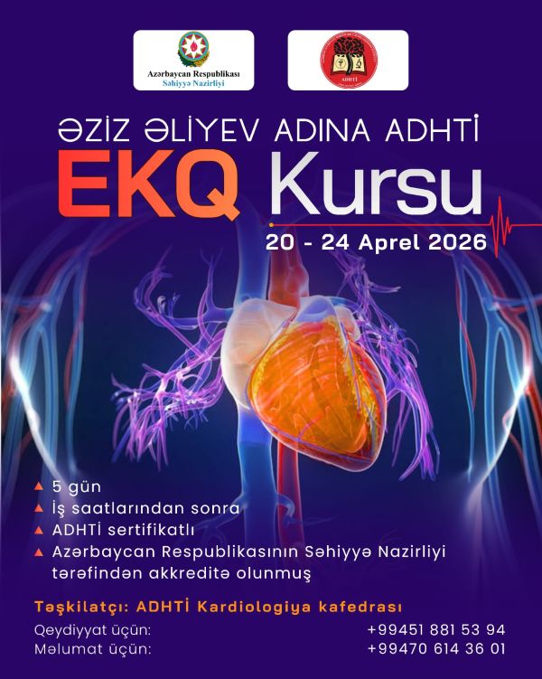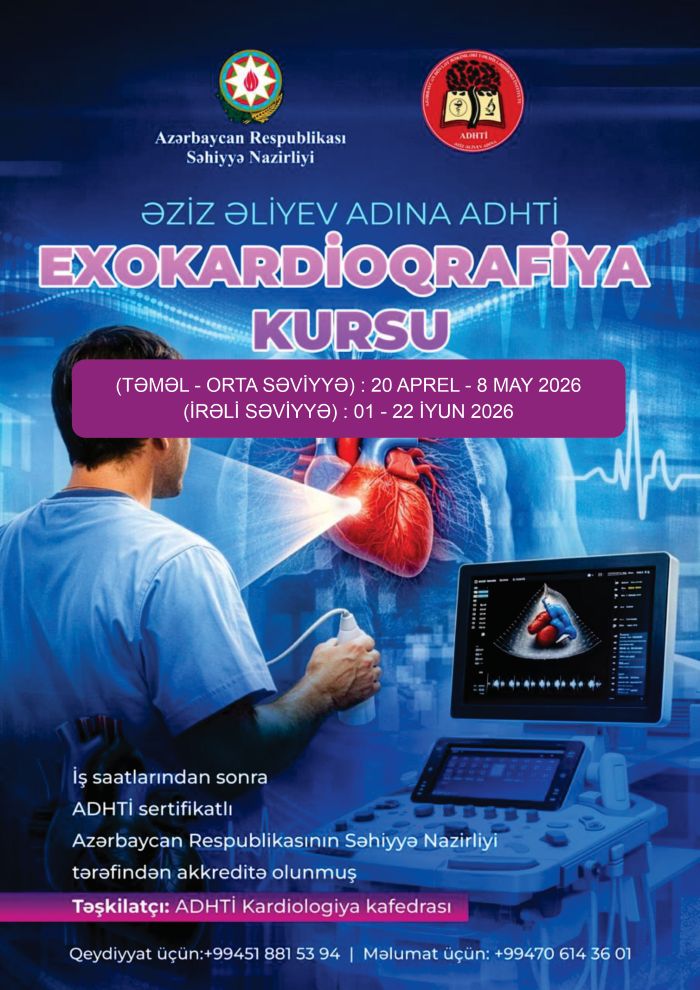 Ə.Əliyev adına ADHTİ-nin kardiologiya kafedrasında praktik yönümlü yeni kurslar təşkil olunmuşdur. Artıq ilk təşkil olunan Elektrokardioqrafiya, Holter Elektrokardioqrafiya, Exokardioqrafiya və Transezofageal Exokardioqrafiya kurslarına qeydiyyat açıqdır. Kurslar aşağıdakı tarixlərdə keçiriləcəkdir: