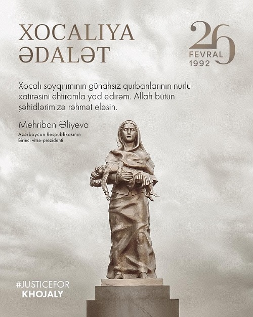 Hər il fevralın 26-da Azərbaycan xalqı Xocalı soyqırımının qurbanlarının xatirəsini yad edir. Bu faciədən keçən illər ərzində Azərbaycan xalqı dünya xalqlarına, dövlətlərinə, beynəlxalq təşkilatlara haqq-ədaləti və həqiqəti müdafiə etmək, Xocalıda törədilmiş terrorizm, etnik təmizləmə faktlarını pisləmək barədə müraciətlər etmişlər. Xocalı soyqırımının günahkarları, təşkilatçıları və icraçıları layiqli cəzalarına çatmalıdırlar. Cinayət cəzasız qala bilməz!