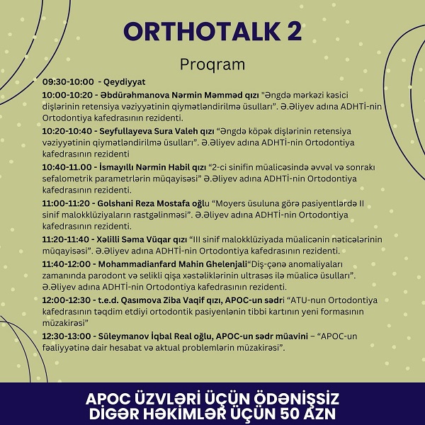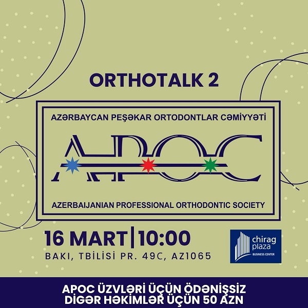 16 mart 2025-ci il tarixində Bakıda «OrthoTalk-2» Azərbaycan Peşəkar Ortodontlar Cəmiyyətinin (APOC) növbəti iclası keçirilmişdir.