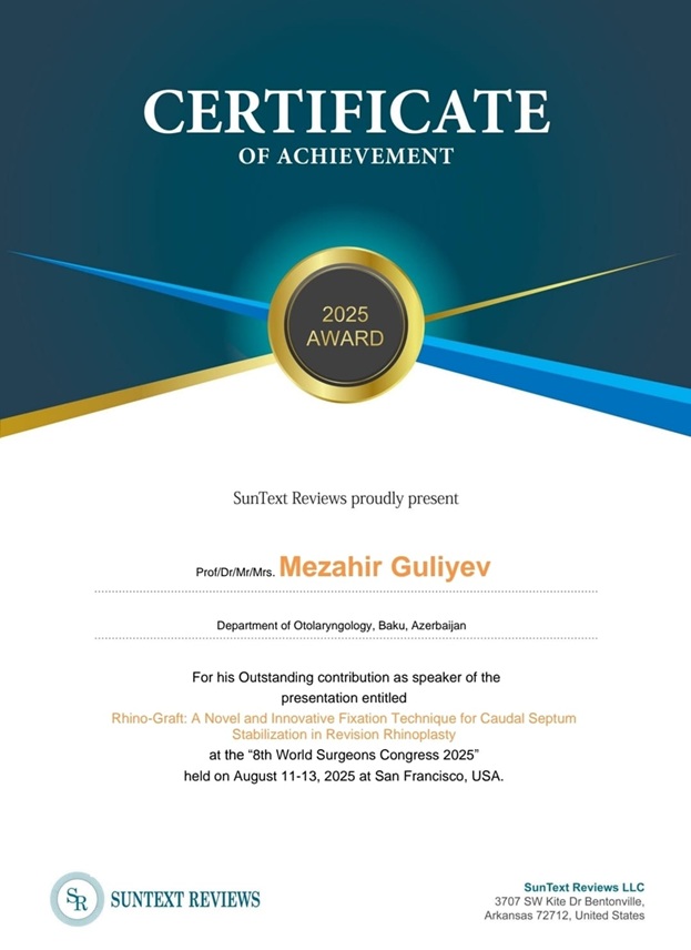 2025-ci ilin avqust ayında isə dosent Məzahir Quliyev ABŞ-ın San-Fransisko şəhərində keçirilən “8th World Surgeons Congress 2025” beynəlxalq konqresində “Rhino-Graft: A Novel and Innovative Fixation Technique for Caudal Septum Stabilization in Revision Rhinoplasty” mövzusunda etdiyi məruzədə də metodika haqqında geniş məlumat vermişdir. Təqdimatın uğuru və elmi yeniliyi səbəbilə, konqresin təşkilat komitəsi tərəfindən bu günlərdə rəsmi məktubla göndərilən nailiyyət sertifikatında elmi işin “2025 Award” mükafatı ilə təltif olunması göstərilmişdir. Bu nailiyyət Azərbaycan otorinolarinqologiya məktəbinin beynəlxalq aləmdə nüfuzunun gücləndirilməsinə mühüm töhfədir və ölkəmizin alimlərinin innovativ elmi işlərinin dünyada tanınmasının bir göstəricisidir.