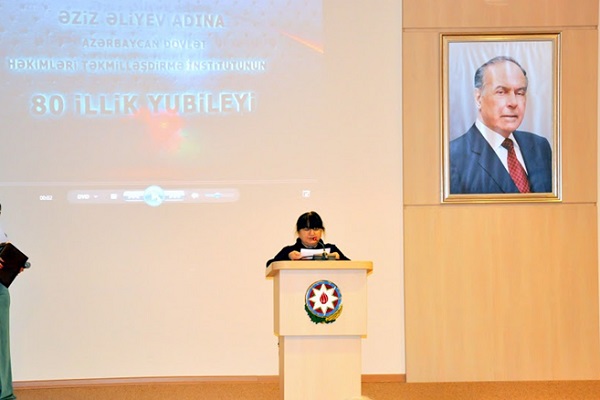 Ə.Əliyev adına Azərbaycan Dövlət Həkimləri Təkmilləşdirmə İnstitutunun 80 illik tarixi və fəaliyyəti haqqında çıxış etmək üçün söz rektor professor N.A.Qasımova verildi.Rektor qeyd etdi ki,institutun 80 illik tarixi ölkəmizdə səhiyyənin inkişafı ilə üst-üstə düşür.Beləki,Azərbaycan səhiyyəsində həyata keçirilən bütün tədbir və quruculuq işlərində institutun kollektivi və ya burada təhsil alıb bir mütəxəssis kimi yetişmiş şəxslər aktiv iştirak etmışlər.İnstitutun yaradılması Respublikanın səhiyyəsi üçün üç vacib məsələnin həllinə köməklik etmişdir: Birincisi - institutun bazasında yüksək ixtisaslı mütəxəssislər toplanaraq sonralar ölkənin məşhur tibb alimlərinin formalaşmasına şərait yaratmışdır.